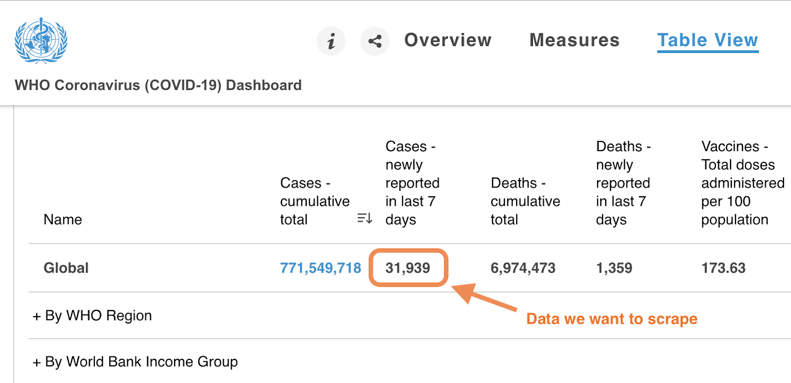 Our goal in this example is to collect last week’s number of COVID cases over the last week from the WHO website.