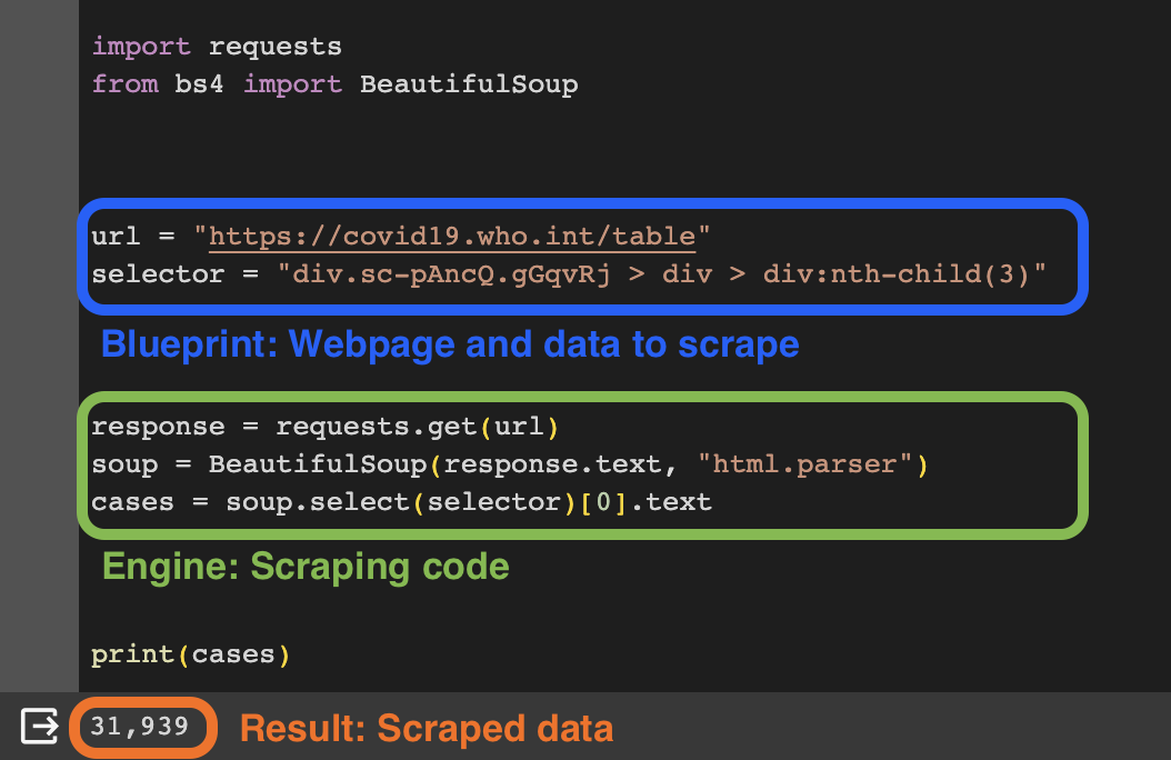 This two-phase process - blueprint and engine - is a typical framework in most data scraping techniques, regardless if they require coding knowledge or not. Simply put, the blue section is your 'What' (What data to scrape?) and the green section is your 'How' (How to get it?).